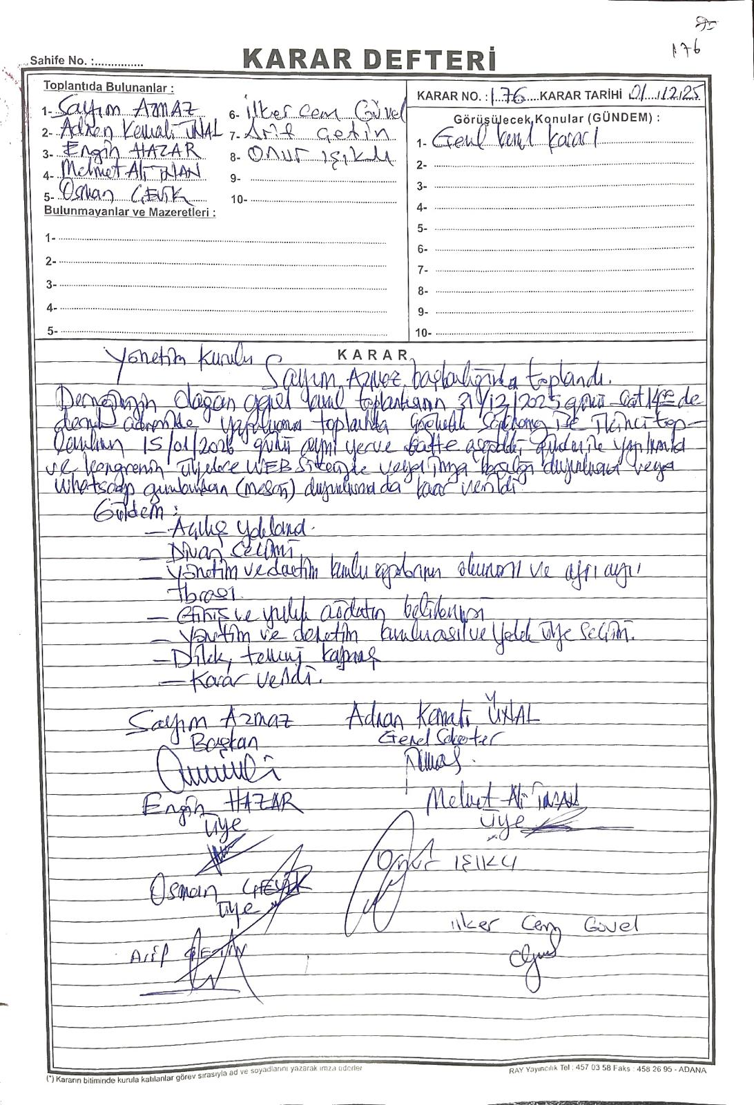 Derneğimiz olağan genel kurul toplantısının 31/12/2025 14:00 tarihine dernek merkezimizde yapılmasına, çoğunluk sağlanamadığı takdirde toplantının 15/01/2026 tarihinde aynı yerde ve saatte yapılmasına, ilan ve kararın web sitesinde, mail yoluyla veya WhatsApp gruplarında mesaj yoluyla duyurulmasına oy birliği ile karar verilmiştir.